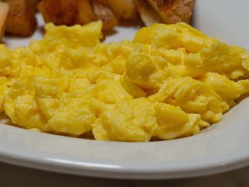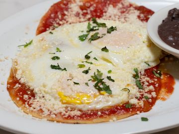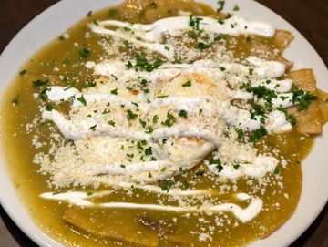 Traditional Mexican breakfast dish composed of tortilla chips, loaded with green sauce or red sauce. Served with two eggs, sour cream and cilantro.