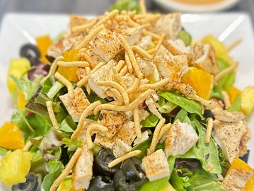 Grilled chicken, spring mix, oranges, pineapple, black olives & chow mein noodles.