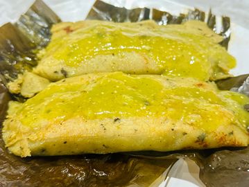 Tamales; a corn flour dough stuffed with pork or chicken meats and steamed.