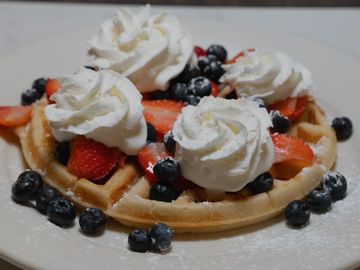 A Belgian waffle with strawberry, blueberries & whipped cream.